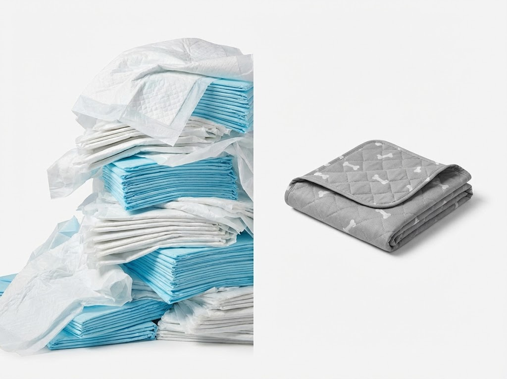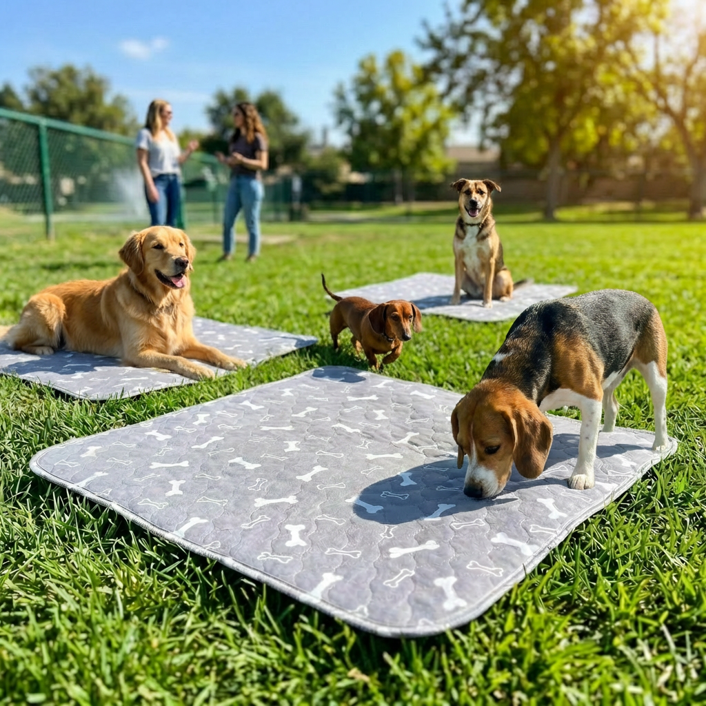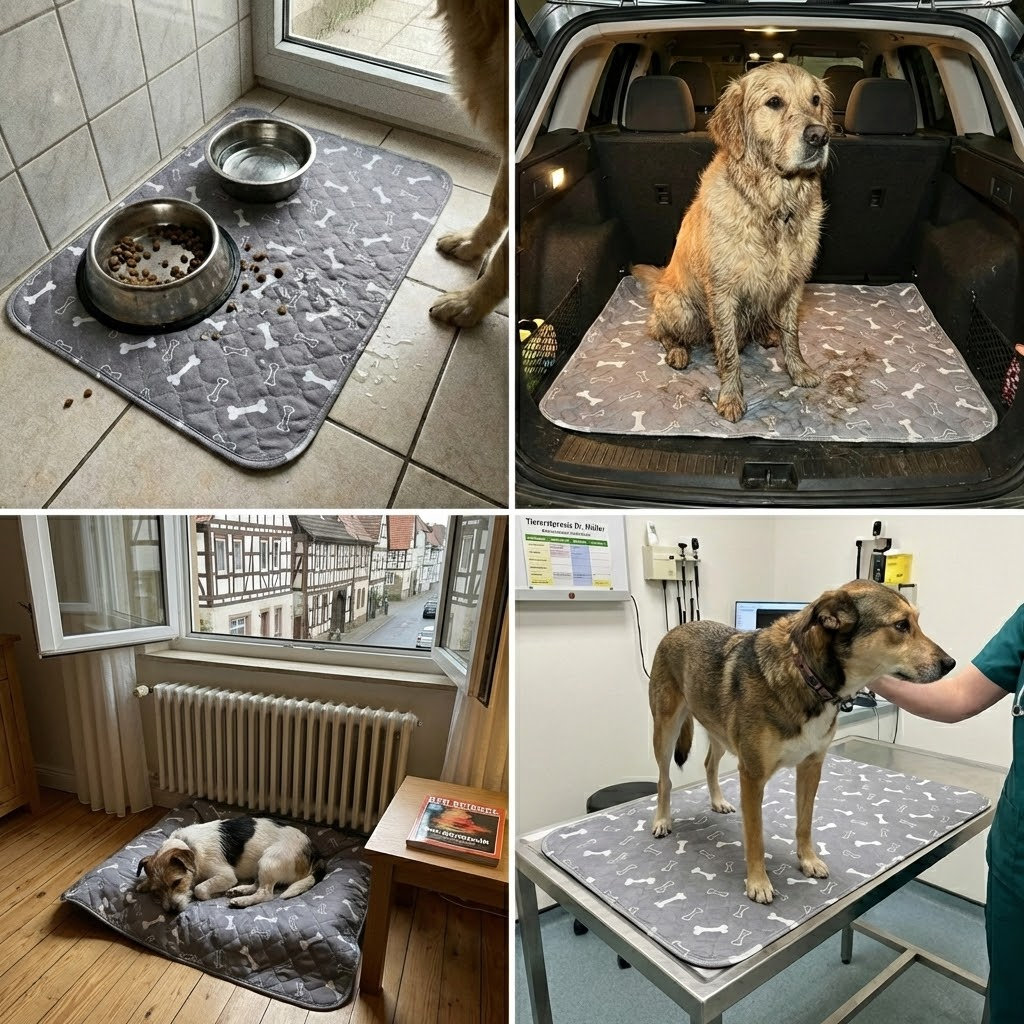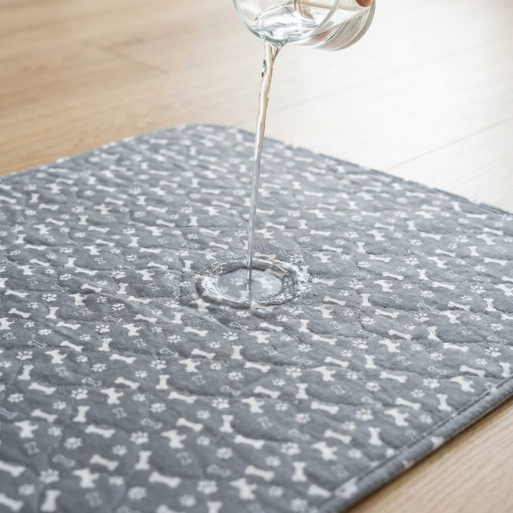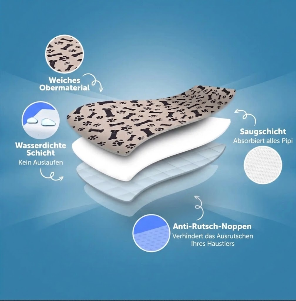 Ganz oben ein weiches Obermaterial, das sich angenehm anfühlt und schnell trocknet. Darunter die Saugschicht, die Flüssigkeit sofort aufnimmt und einschließt – deswegen bleibt die Oberfläche trocken, auch wenn dein Hund gerade erst drauf war